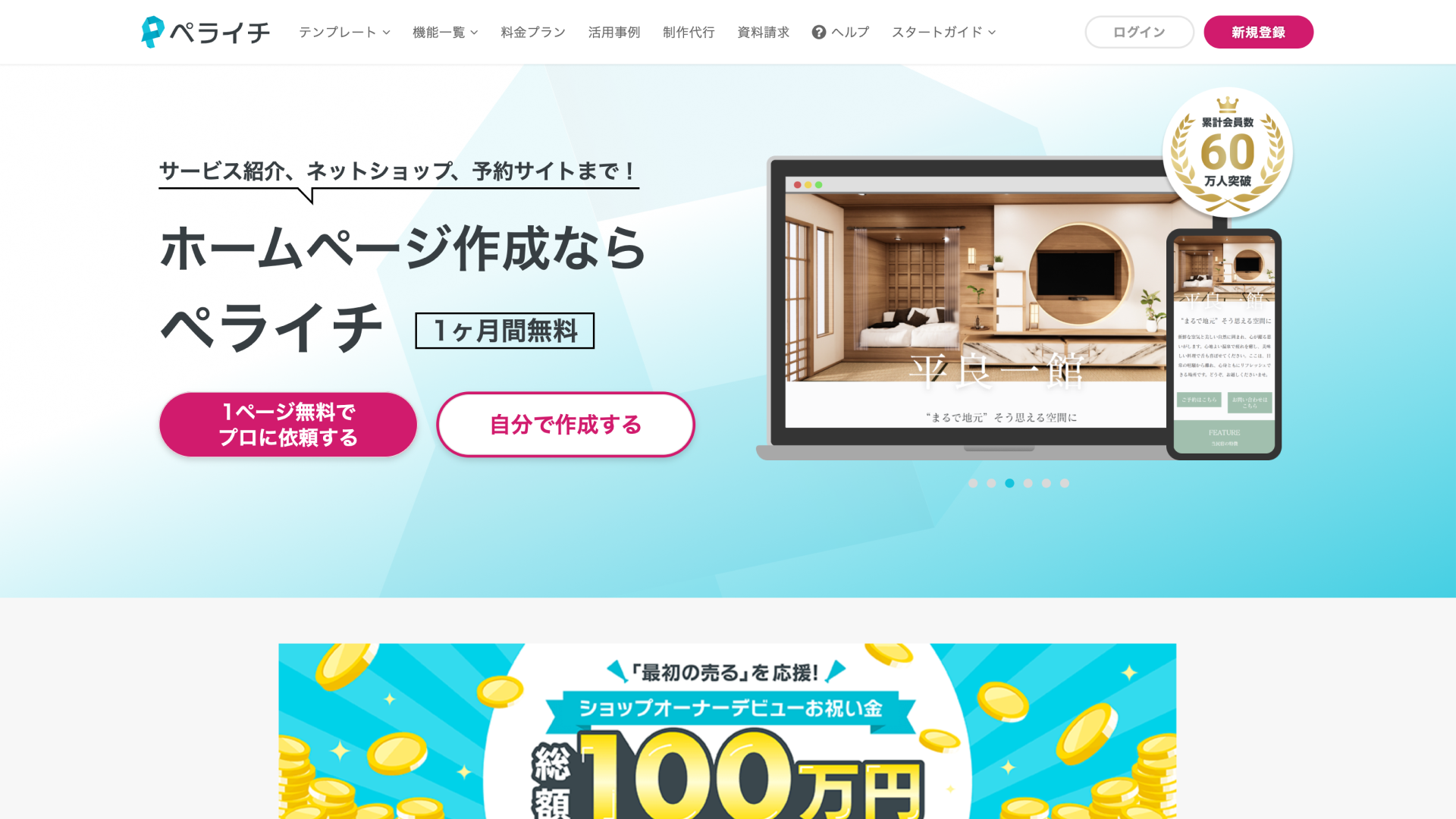ペライチは、Webの知識や予算がなくても、誰でも簡単に、そしてスピーディーに本格的なウェブサイトを作成できる、まさに個人事業主やビジネス初心者のためのツールです。テンプレートを使えばプロ並みのデザインが手に入り、多機能なのでビジネスに必要なことはすべてペライチ一つで完結します。